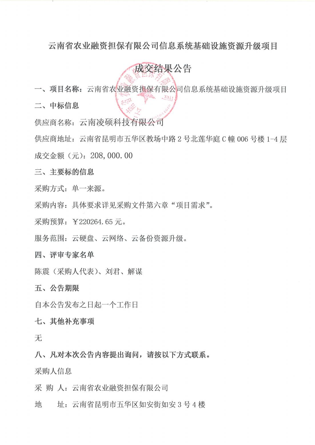 云南省农业融资担保有限公司信息系统基础设施资源升级项目成交结果公告