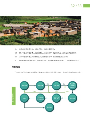 32 33 (4) 申请者征信记录良好,无其他恶习,无违法违规行为; (5) 农民专业合作社的法人(实际控制人)品行良好,信用意识强,无其他跨界投资行为; (6) 农民专业合作社主动愿意配合开立资金结算账户、保后管理的相关工作; (7)农民专业合作社经营正常,资金流转正常,具有履行相关合同的能力,能保障贷款的偿还。 简要流程 “云农担-农合贷”担保产品从借款客户申请到实行放款,时效性控制在18个工作日以内,担保费率 1.5%/年。 简要流程图