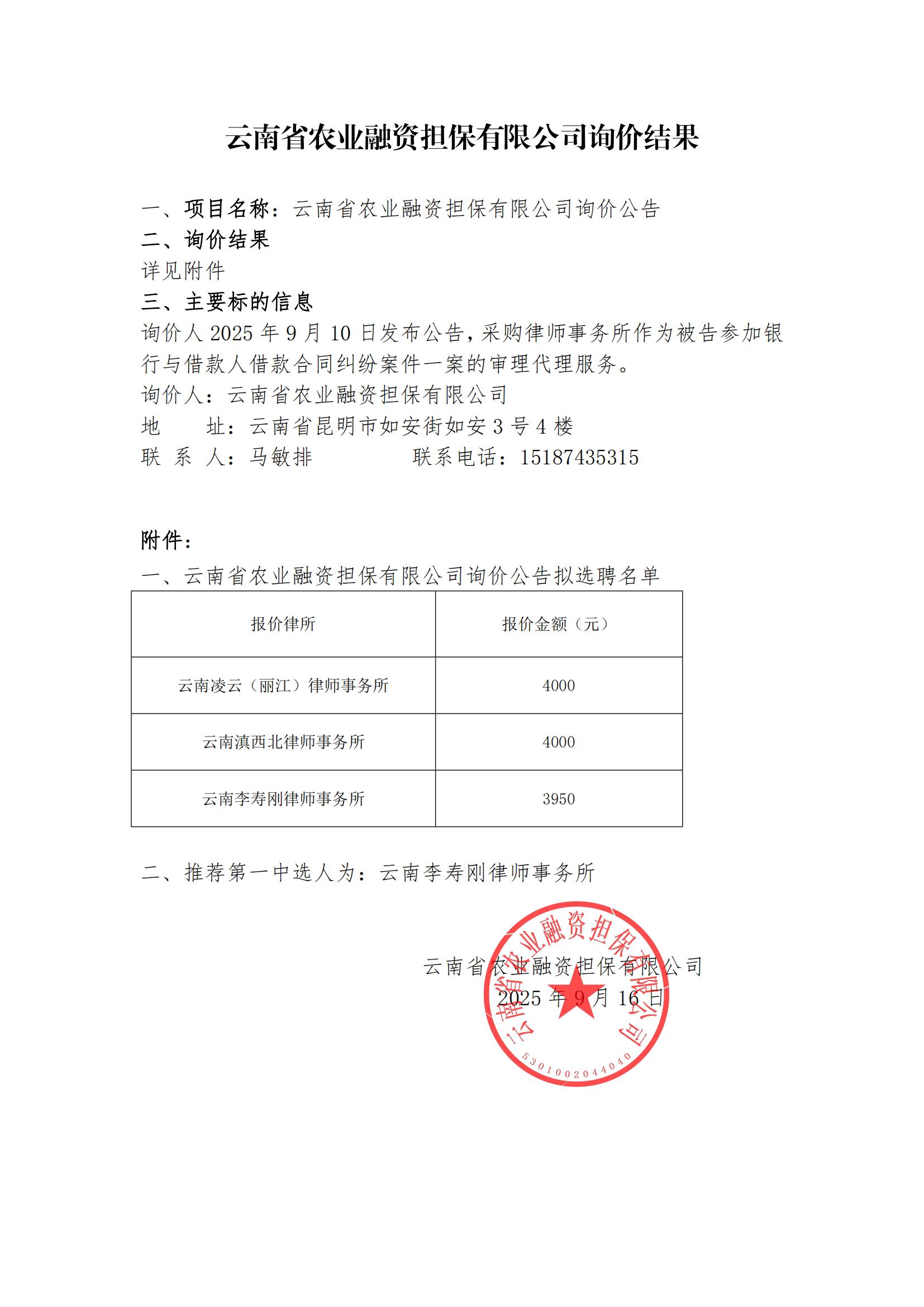 云南省农业融资担保有限公司询价结果