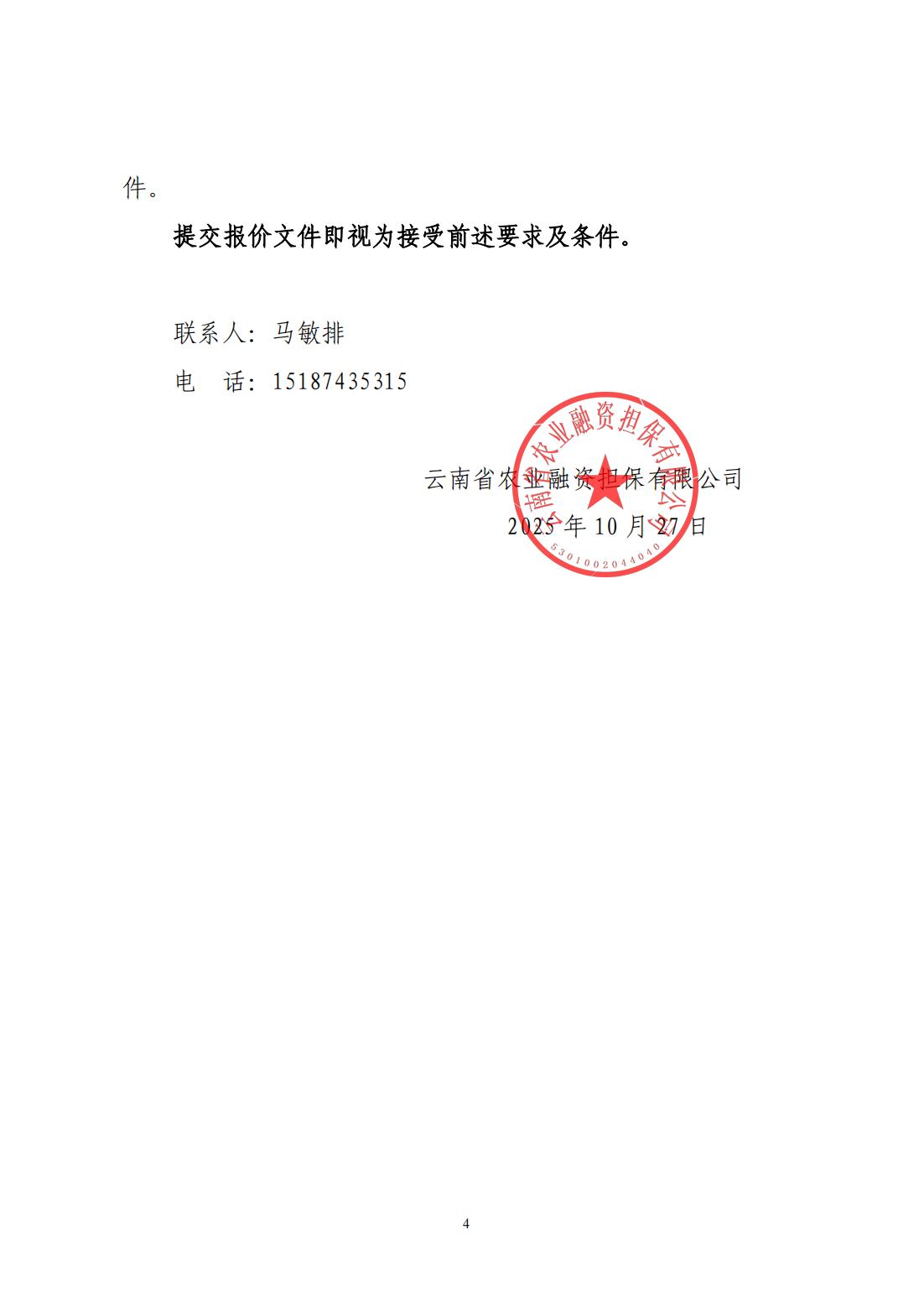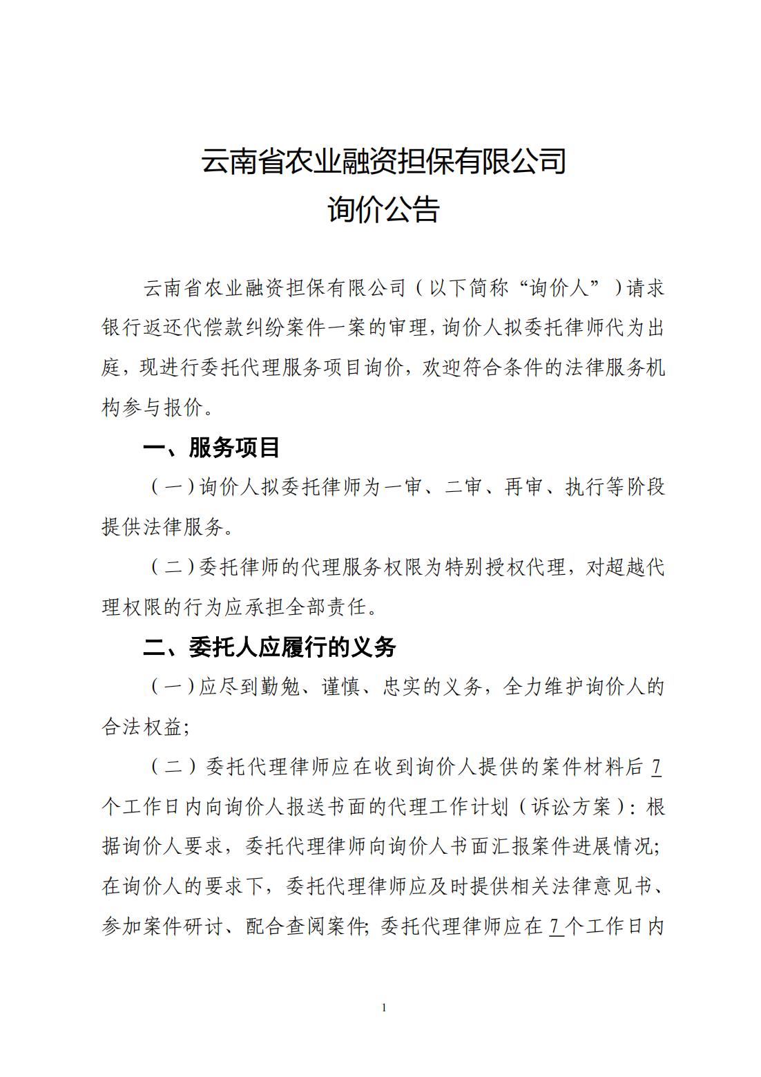云南省农业融资担保有限公司询价公告